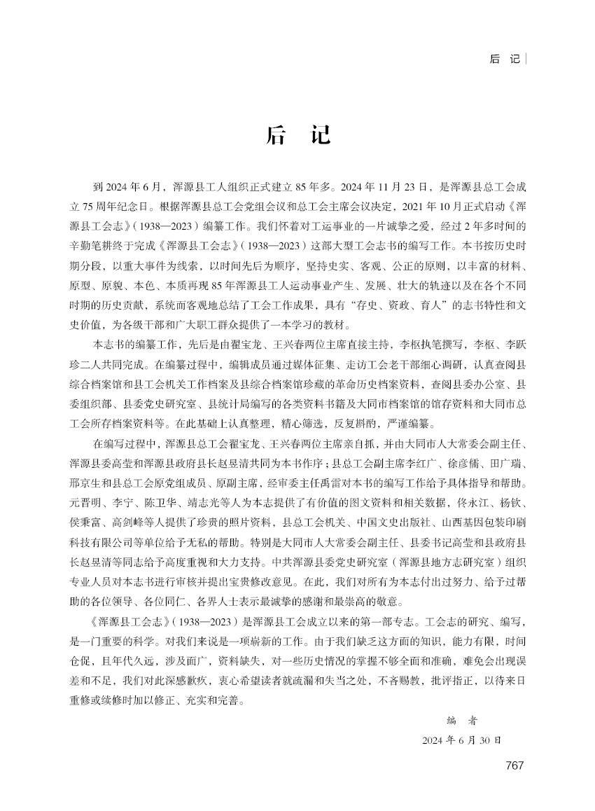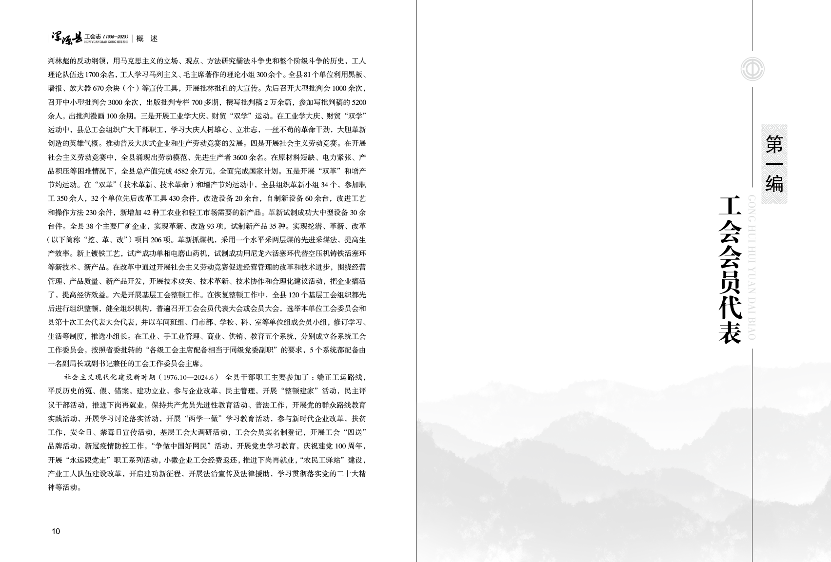 本志書采用編、章、節(jié)三級設置目錄,按照編年體裁采用現(xiàn)代漢語語體文記述,上限為1938年,下限至2023年,時間跨度共85年。全書分6編18章86節(jié)?!洞笫掠洝匪鏁r間從1938年起至2024年6月。大事記中記述了2024年上半年渾源縣工會的大事。