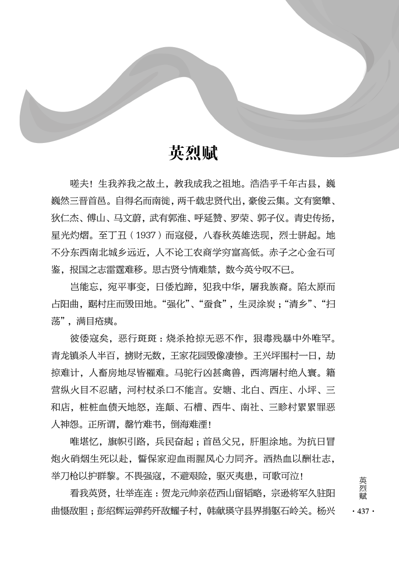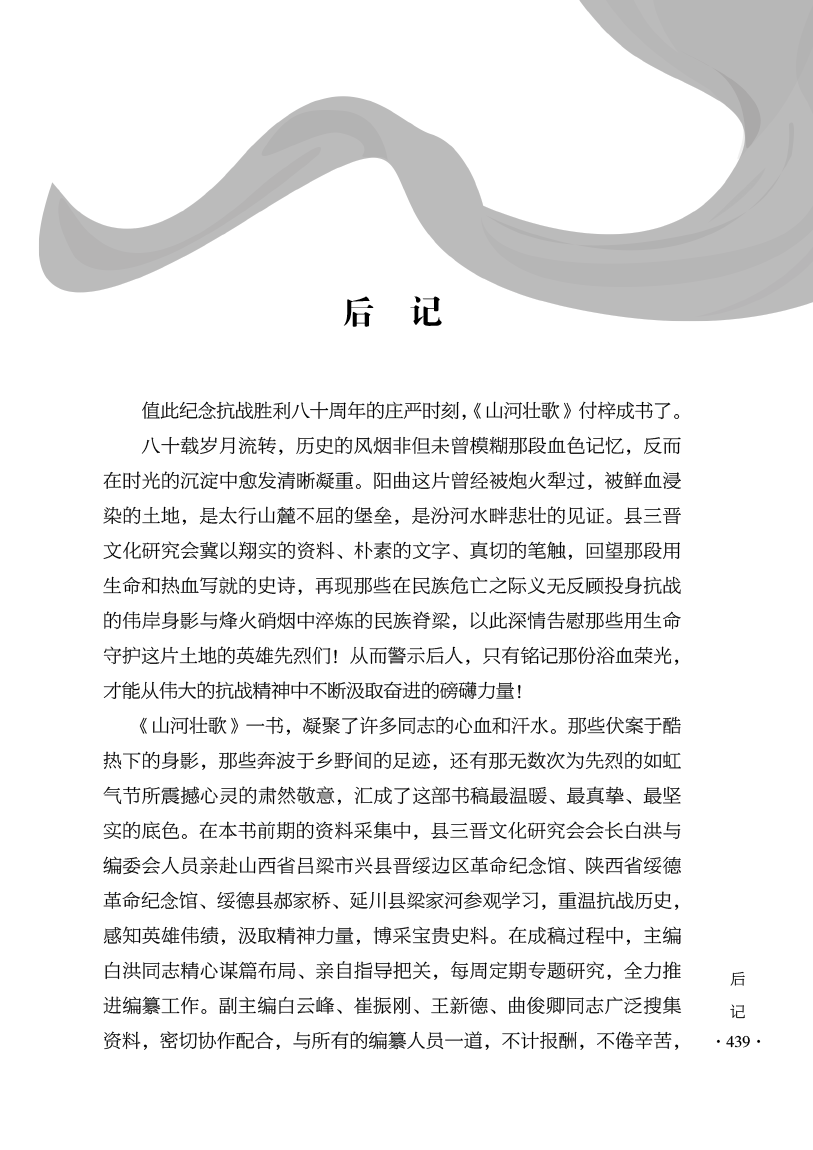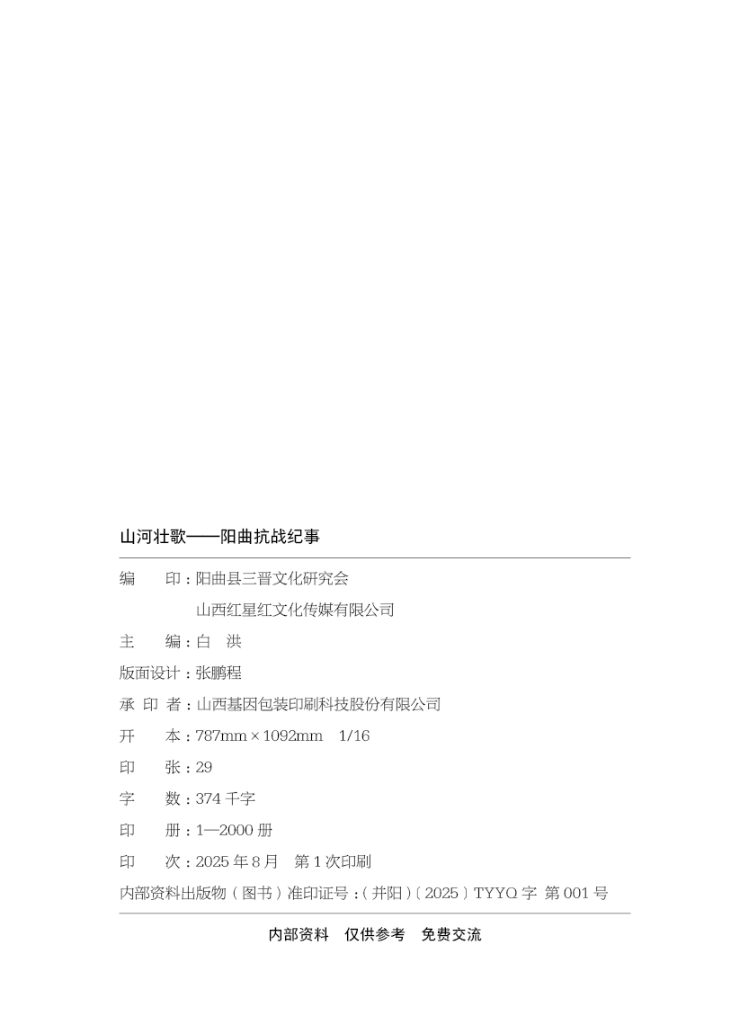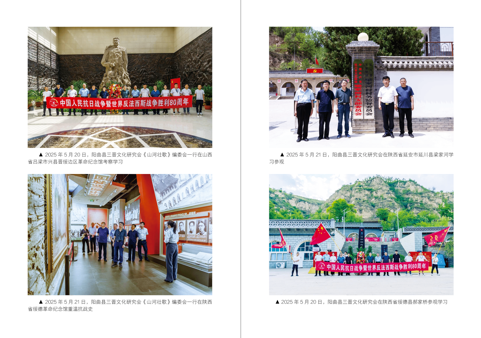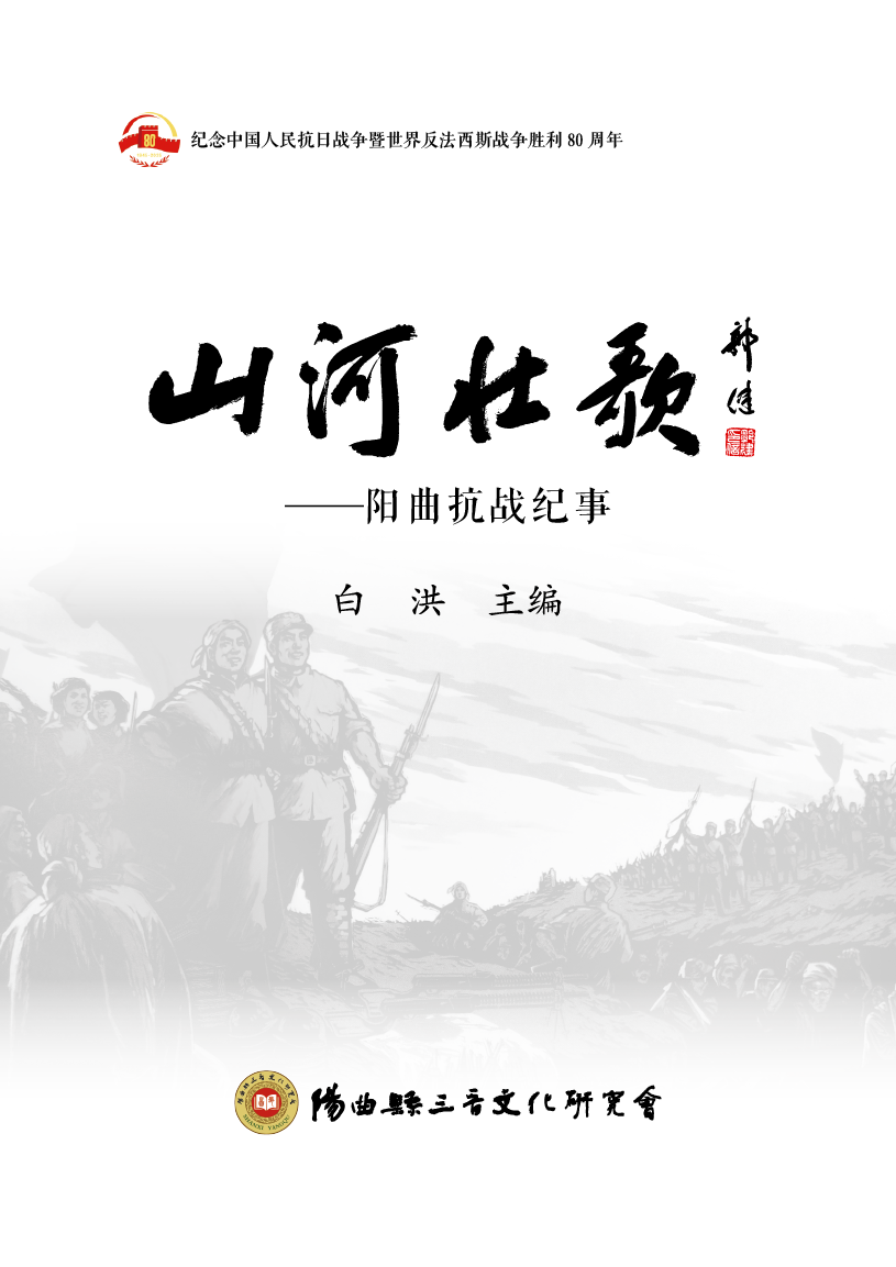 當(dāng)歷史的指針再次指向那場(chǎng)決定民族命運(yùn)的勝利時(shí)刻,我們迎來(lái)了紀(jì)念中國(guó)人民抗日戰(zhàn)爭(zhēng)暨世界反法西斯戰(zhàn)爭(zhēng)勝利80周年的莊嚴(yán)節(jié)點(diǎn),陽(yáng)曲縣三晉文化研究會(huì)滿懷著對(duì)家鄉(xiāng)紅色基因的敬仰而對(duì)一座“精神富礦”進(jìn)行了深度挖掘,組織編纂了《山河壯歌》一書(shū),讓我們重溫那些在烽火歲月中淬煉的民族記憶,讓我們弘揚(yáng)那些已經(jīng)融入民族基因的抗戰(zhàn)精神,讓我們銘記歷史、緬懷先烈、珍愛(ài)和平、開(kāi)創(chuàng)未來(lái)。