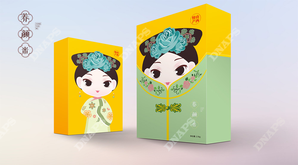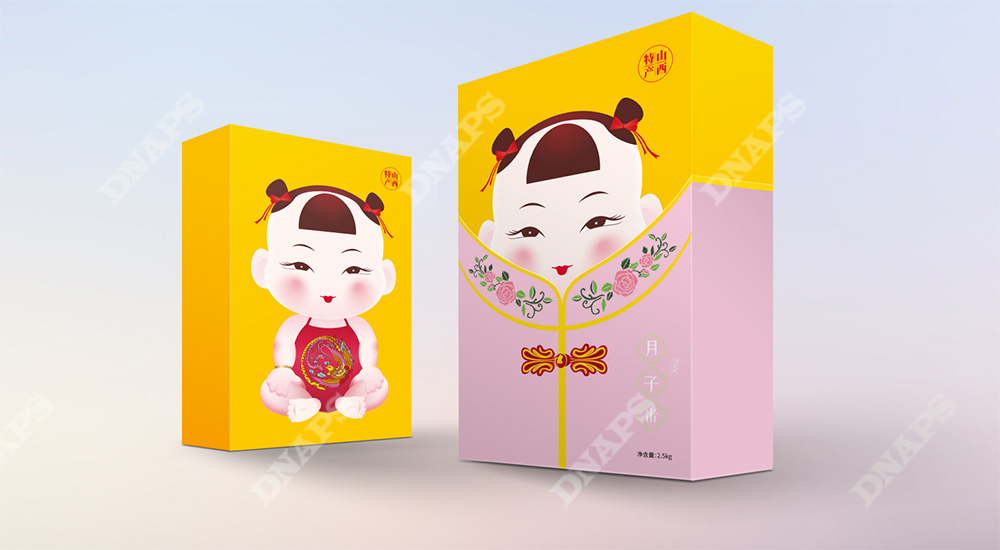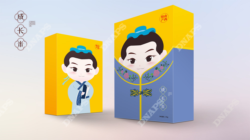 區(qū)別于傳統(tǒng)小米包裝,根據(jù)小米的不同搭配將小米分為月子米,成長(zhǎng)米,養(yǎng)顏米3類,視覺(jué)上分別以成對(duì)的嬰兒、小孩、年輕女性/媽媽為主要形象元素,采用現(xiàn)代插畫的形式創(chuàng)造三組萌趣生動(dòng)的形象,畫面生動(dòng)富有張力,配色清醒典雅,增強(qiáng)產(chǎn)品親和力。包裝盒外加設(shè)計(jì)有古典服飾圖形的封套,整體形式新穎富有層次感,拆掉封套將呈現(xiàn)另一幅畫面,開盒有趣味,讓整體形成記憶點(diǎn)。