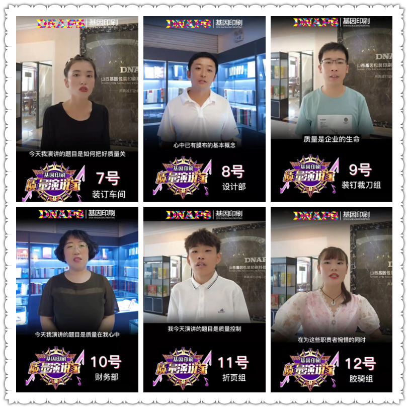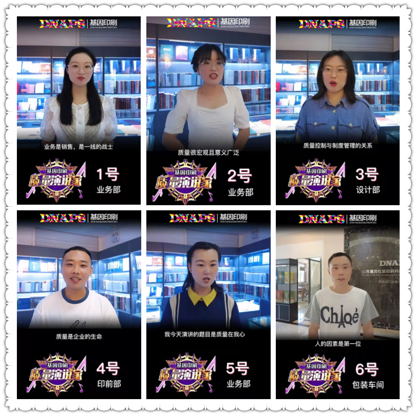 為了讓“質(zhì)量”意識(shí)深入人心,基因印刷組織了一場(chǎng)別開生面的“質(zhì)量演說(shuō)家”演講比賽。負(fù)責(zé)人積極商討比賽形式,最后決定通過視頻錄制的形式公開發(fā)布在線上請(qǐng)客戶和全體員工投票。票選出的優(yōu)秀代表在本周六的質(zhì)量大會(huì)上進(jìn)行現(xiàn)場(chǎng)的演講。新穎的比賽形式激發(fā)了全體員工的熱情,各部門員工踴躍參與,利用早會(huì)和空余時(shí)間進(jìn)行練習(xí)和彩排,最后共有16人脫穎而出。不同部門的員工從不同的角度詮釋了自己對(duì)“質(zhì)量”的理解,一遍遍的練習(xí),一遍遍的重復(fù),不僅演講人自己,聽的人也在不知不覺中對(duì)“質(zhì)量”有了自己的思考。